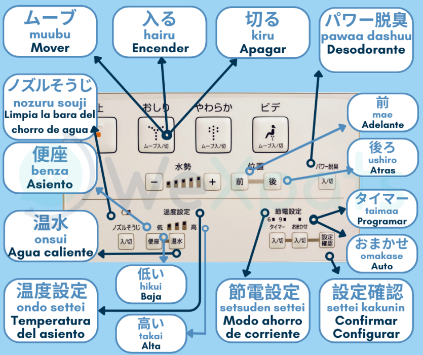 En este texto ofrecemos las traducciones de los botones para poder operar los lavabos nipones. En Japón, la costumbre por la limpieza va desde el cuerpo al alma. La empresa Toto ha perfeccionado unos sanitarios llamados "washlet", puestos en venta en 1980. Estos permiten lavarse, luego de utilizarlos, son muy famosos!