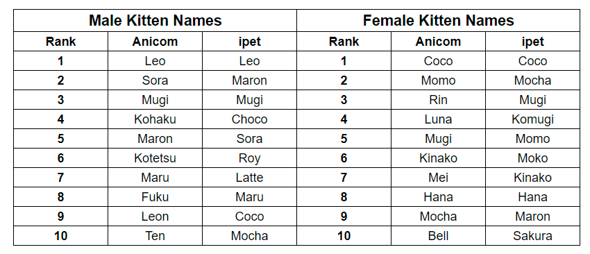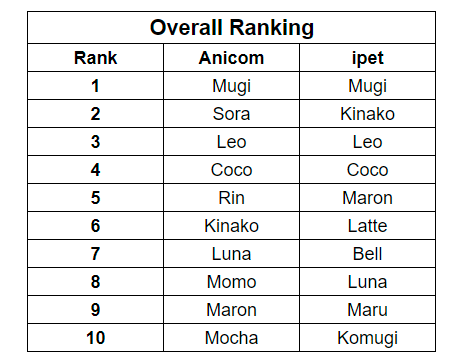 (From above rankings) Mugi, Komugi, Kinako, Latte, Maron, Coco, Mocha