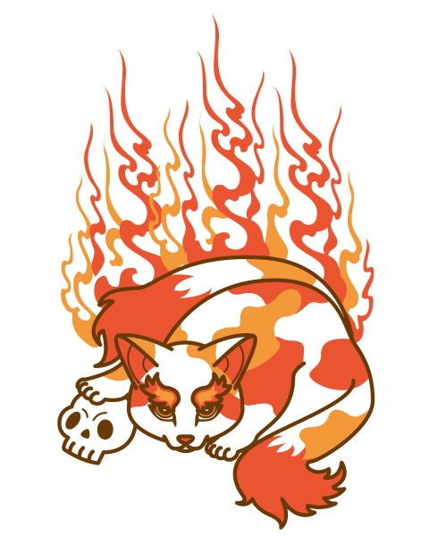 Literally translated to “flaming chariot”, Kasha are Yokai that eat corpses. The more aggressive Kasha are said to attack funeral processions to steal the corpses, whilst others would steal from graves. Kasha are described as a humanoid cat wrapped in flames, or just with flaming tails.