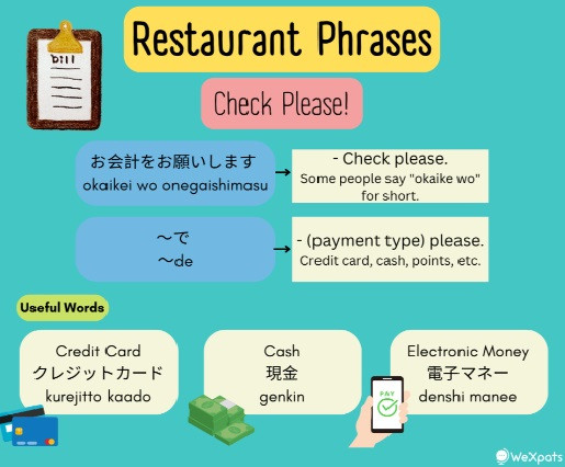 Some people simply say 「お会計を (Okaikei wo)」 for short.