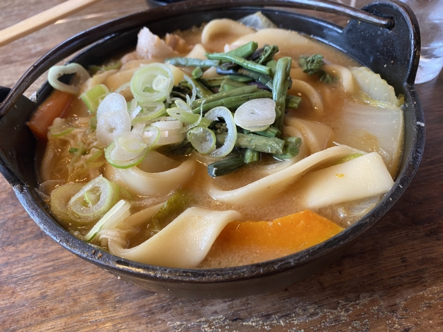 Houtou is a dish of flat noodles made from wheat flour and other ingredients boiled in miso soup. Vegetables such as pumpkin, potatoes, radishes, carrots, Chinese cabbage, and fried tofu are added as ingredients. It is a dish that is often made in winter because it warms up the body. Houtou is often made as a main dish in areas surrounded by mountains in Yamanashi Prefecture, which are not suitable for rice production. Since various vegetables are used as ingredients, it is highly nutritious, and can be said to be a dish created from the wisdom of Japanese predecessors.