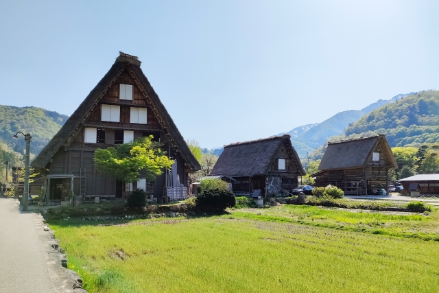 Gassho-zukuri is a unique architectural style that exists only in Shirakawa-go in Gifu Prefecture, Gokayama in Toyama Prefecture, and their surrounding areas. It features a steep thatched roof and is designated as a UNESCO World Heritage Site. Many were made 100 to 200 years ago, and the oldest is said to have been made 400 years ago. The gassho-zukuri village has rice fields and forests, and is a place where you can enjoy the scenery of olden day Japan.
