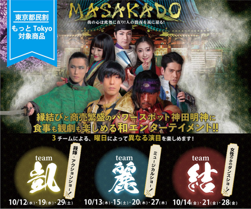 A performance that weaves the story of Taira no Masakado (平将門), who is associated with Kanda Myoujin, accompanied with traditional Japanese music, dance, and visuals. Performed in a theatre-restaurant, enjoy the live theatrical performance while enjoying a meal.