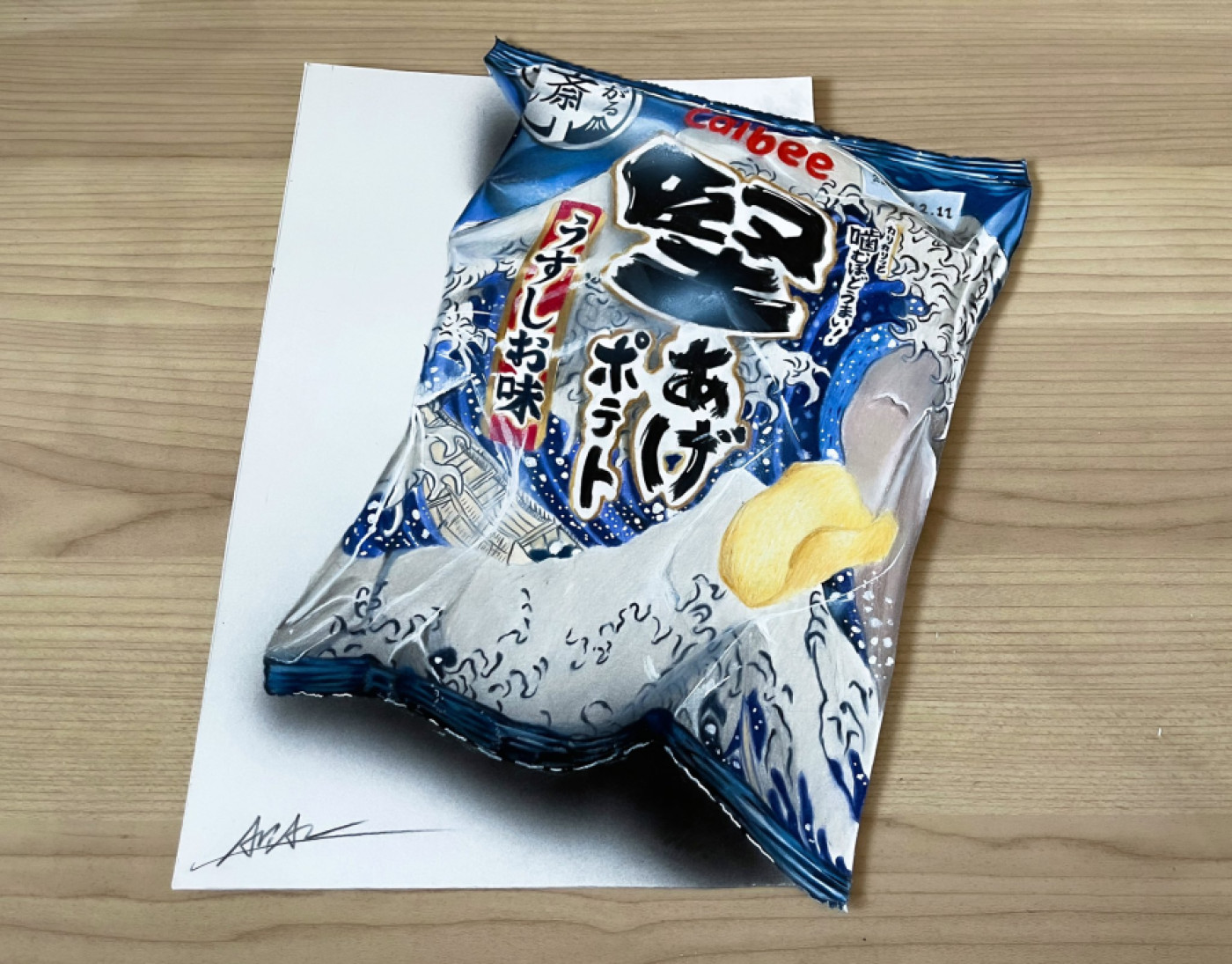 They even drew this potato chip bag of a special collaboration between Calbee and the Sumida Hokusai Museum of Hokusai’s famous artwork The Great Wave off Kanagawa.