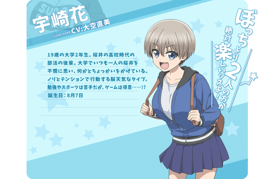 Uzadere Characters : Uzaki Hana (Uzaki-chan wa Asobitai!), Takeda Harumi (Senpai ga Uzai Kouhai no Hanashi / My Senpai is Annoying), Monkey D. Luffy (One Piece), Inosuke Hashibira (Kimetsu no Yaiba / Demon Slayer), Power (Chainsaw Man)