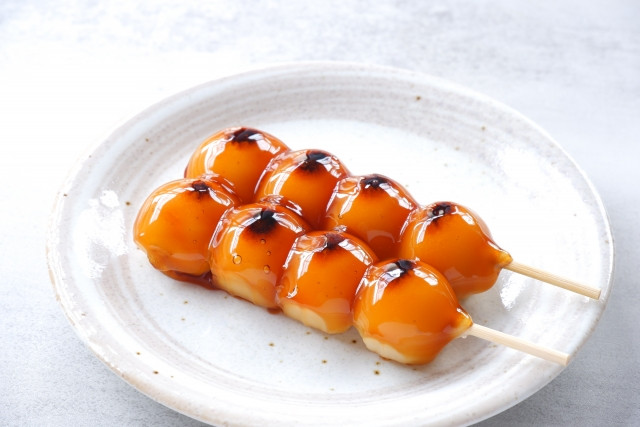 Mitarashi Dango are grilled skewered dango with a sweet soy sauce glaze. The sticky dumplings intertwined with the sweet salty glaze gives it a unique exquisite taste. Mitarashi Dango are easily available in supermarkets, so give them a try.