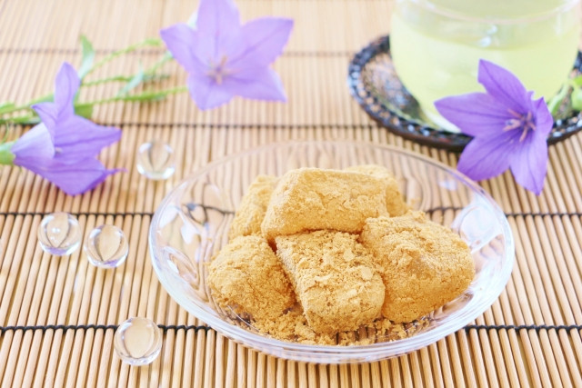 Warabi-Mochi is soft mochi made from bracken flour (わらび粉; warabi ko / warabi flour) and served with kinako (きなこ; soybean flour) or brown sugar. With a cool, moist texture, warabi-mochi is a well-known summer delicacy, and can be found in shops during early summer.
