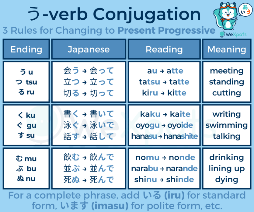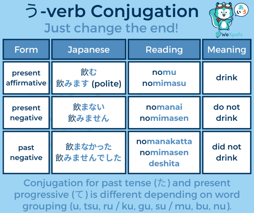 Verbs are words that are used to describe actions, state of something happening, or occurrences. The most important thing about learning Japanese verbs is how to conjugate them, which changes the meaning of the verb - from tenses to politeness level, and affirmative to negative.