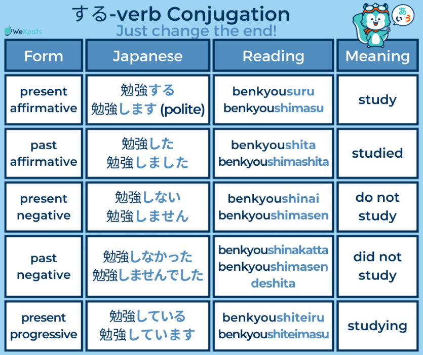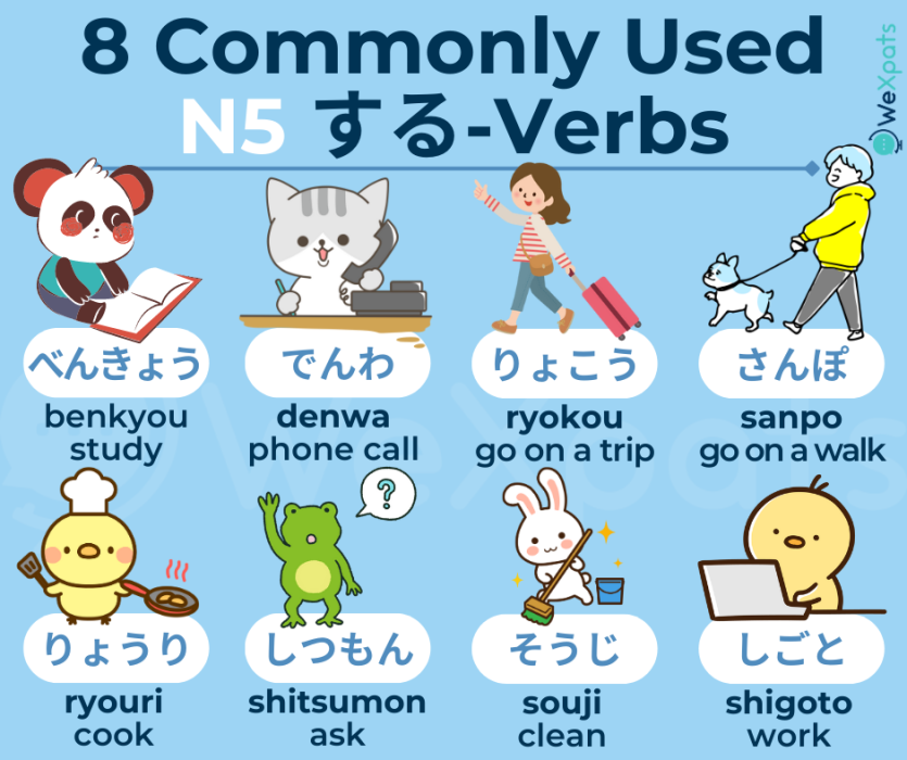 Here’s a list of 16 Suru-verbs that you need to learn for the test and are commonly used in daily life. There are not many at the N5 level.