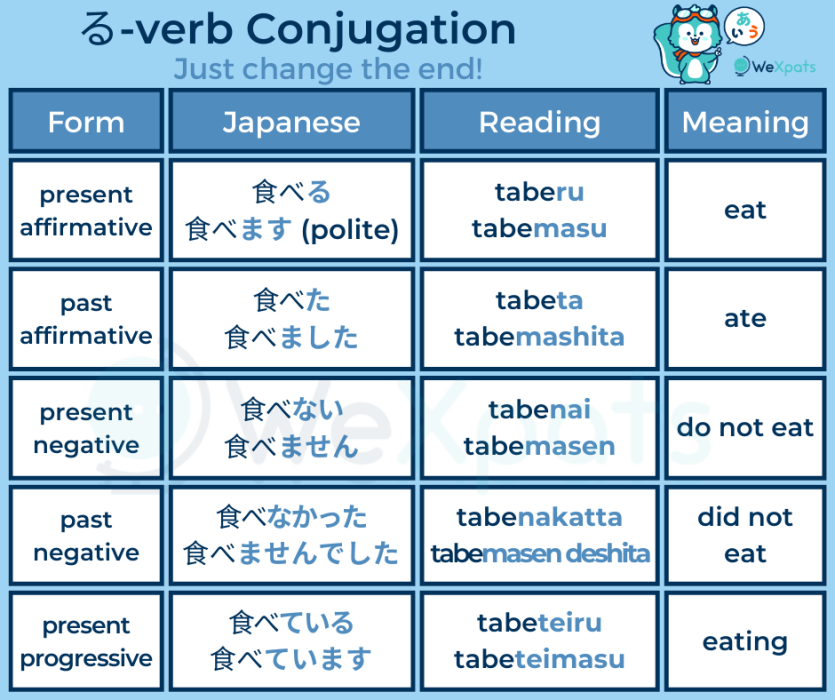 Ru-verbs are easy to conjugate. All you need to do is to change the る (ru) to conjugate the verb into polite form, past tense, present negative, past negative, or present progressive.