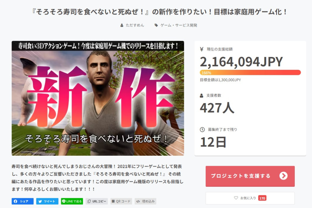※Campfire, “『そろそろ寿司を食べないと死ぬぜ!』の新作を作りたい!目標は家庭用ゲーム化!”