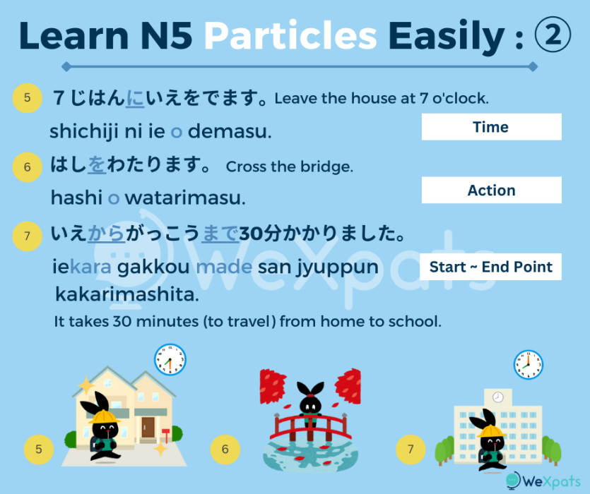 As you can see in the N5 Particles List above, there are many different ways to use particles. Therefore, it is more effective to remember how to use each one than to translate and memorise the particles’ meanings.