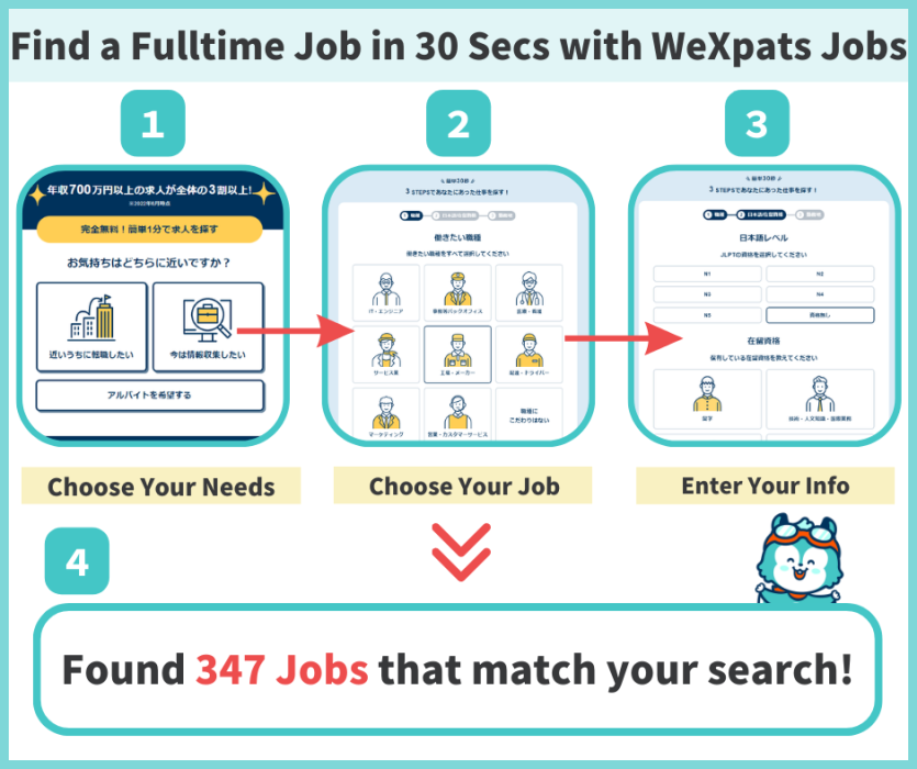 You can search for jobs in 11 languages (English, Vietnamese, Korean, Indonesian, Traditional Chinese, Simplified Chinese, Burmese, Thai, Spanish, Portuguese), including Japanese, so it’s fine even if you don't have confidence in your Japanese. There are 2 patterns for finding jobs !