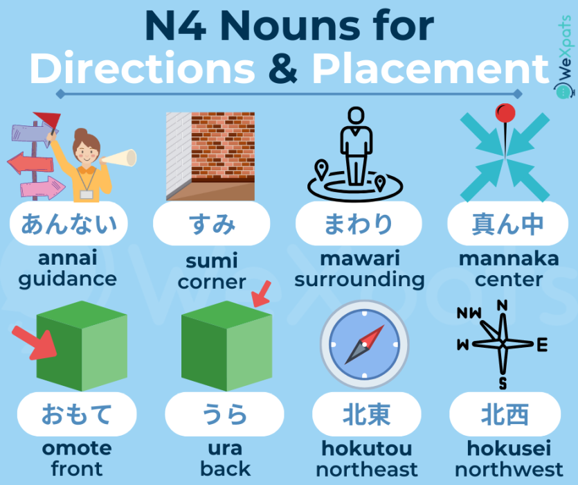 Knowing the directions and where you are is important when visiting tourist attractions and asking for directions. We have already learned how to say the individual four cardinal directions in Japanese at the N5 level. In N4, we will study the intercardinal directions that are in the same order as English. For example,「北東」(hokutou)」is 北 (north) + 東 (east) = northeast.