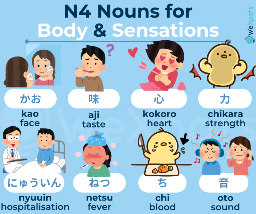 Continuing from N4 Nouns List (Part 3), in Part 4, you will learn nouns related to daily life that are divided into 6 categories of people, home & living, body & sensations, clothing, food & drinks, and things. They total up to 126 nouns that correspond to the JLPT N4 level. Study the meaning and usage of each noun.