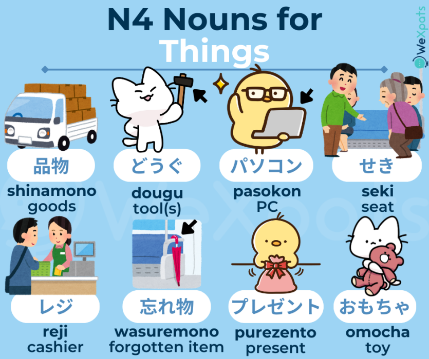 These nouns are the names of “things” around us. At the N4 level, we will introduce the names of familiar objects that we often see in our daily lives.