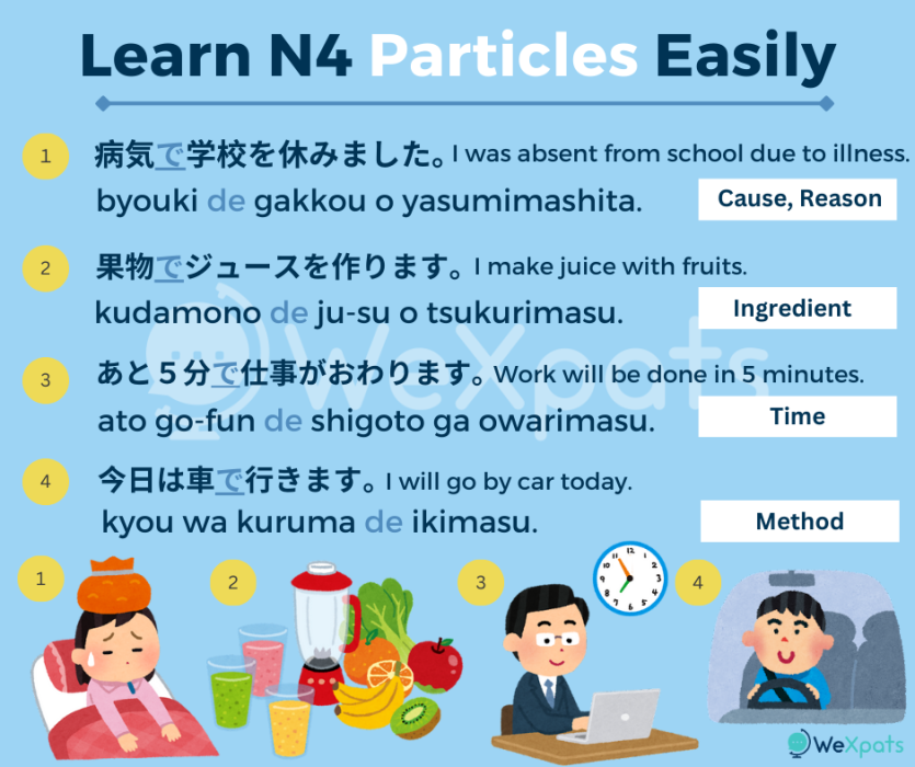 This table summarises the particles found in N4 level. Let’s remember their meanings and usages by referring to the example sentences.