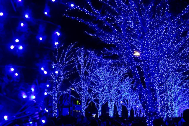 Blue Cave SHIBUYA is held along Shibuya Koen-dori to Yoyogi Koen-dori. Leisurely walk down the bustling Shibuya streets to Yoyogi Park, and you will see the scenery change from busy crowds and commercial shops to a dazzling forest of blue. Around 600,000 LED light bulbs are used to dye this park in a mysterious blue light.