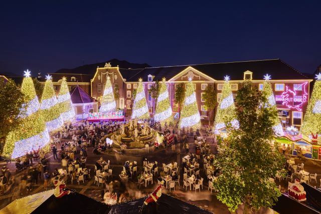 Apart from illuminated Christmas trees and flower fields, the most famous wisteria trellises that form curtains of wisteria flowers hanging down are recreated in a dazzling array of colours.