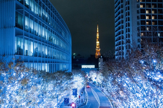 The Keyakizaka Illumination is the highlight of the Roppongi Hills Christmas event. The 400 m long Keyaki-dori is lined on each side with blue and white illuminated trees to this year’s theme of “SNOW & BLUE”. At the end of the street is the symbolic Tokyo Tower that stands out bright red and orange above the sparkling whites and blues. With the addition of a Christmas Market in O-Yane Plaza and restaurants in the area offering special Christmas menus, it makes for the perfect romantic Christmas outing.