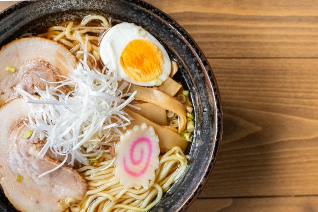 Ramen is the most well-known form. Ramen consists of ramen noodles served in a bowl of flavourful broth and topped with various toppings like char siu, sliced green onions, ajitama (marinated egg), bamboo shoots, etc.
