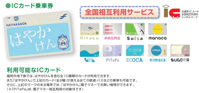 Hayakaken, typically written in Hiragana はやかけん, is offered by the Fukuoka City Transportation Bureau and is primarily used for public transportation in Fukuoka City. Its name is an acronym for 速い (Hayai), 優しい (Yasashii), 快適 (Kaiteki) and 券 (Ken), aka speedy, friendly, comfortably, card. Hayakaken’s mascot is a prairie dog named “Chikamaru”