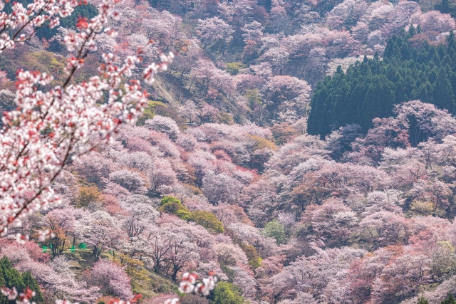 At Mount Yoshino (吉野山) in Yoshino City, Nara Prefecture, you can admire the 30,000 cherry trees in full bloom that cover the entire mountain. This impressive scenery, considered one of Japan’s three major cherry blossom viewing spots, is also recommended for those who are tired of cherry blossom viewing in parks. The cherry trees bloom in order from the bottom to the top of the mountain, so it can be enjoyed for a long period of time.