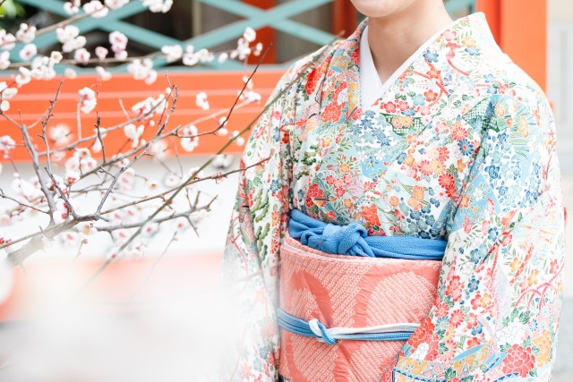 As for pink plum blossoms, they also carry the meaning of “purity” due to their light colour that gives a feeling of freshness and softness. Pink plum blossoms are common motifs for children’s Kimono.