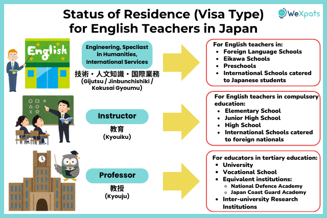The “Engineering / Specialist in Humanities / International Services” status of residence (visa) is required to work as an English teacher in foreign language schools (語学学校), Eikaiwa schools (会話教室), and preschools (プリスクール). Of the three fields, English teachers fall under the category of “International Services).