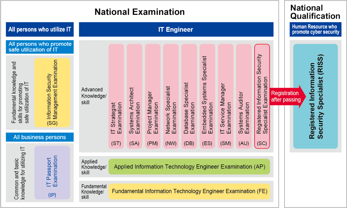 The Information Technology Engineers Examination (ITEE) administered by the Information-Technology Promotion Agency (IPA) in Japan is a group of national qualification exams in which the Ministry of Economy, Trade and Industry certifies that you are an IT professional that meets the standards of IT knowledge and skills. There are 13 categories of examinations (refer to image above). The exams held in Japanese.