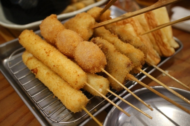 Kushikatsu is an Osakan kebab. The contents, which may be meat, seafood or vegetables, are breaded and deep-fried until golden and crispy. These Japanese skewers are served with a sauce and the important rule to remember is to not dip twice. Most restaurants serve Kushikatsu with strips of cabbage on the side and other than aiding digestion, they can also be used to scoop extra sauce. Twelve Kushikatsu Daruma restaurants are available all around Osaka, boasting forty different dipping sauces. Average meal budget goes from 1,500 to 2,500 yen.