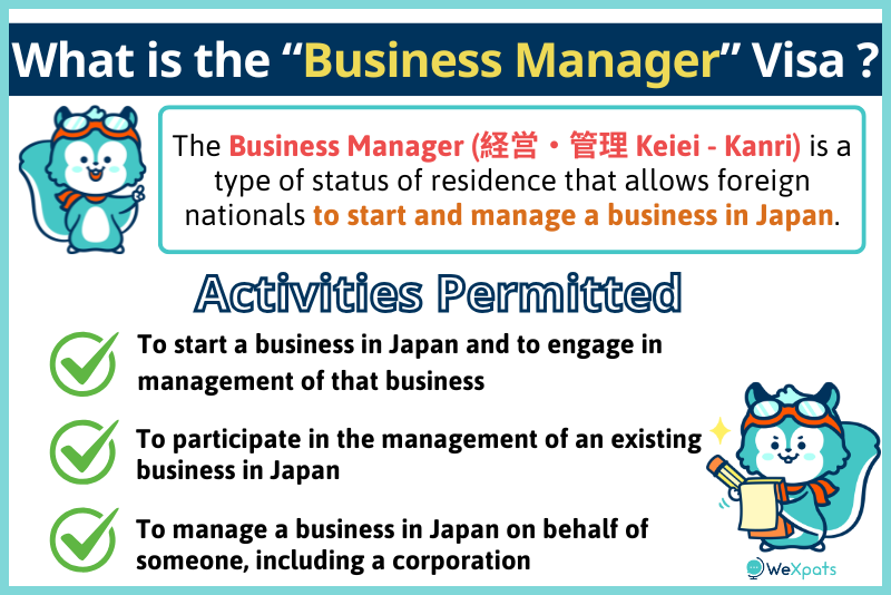 The business visa in Japan, officially called “Business Manager (経営・管理; Keiei Kanri)”, is a status of residence (visa) type for foreign nationals intending to start or manage a business in Japan.
