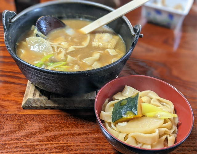 A local specialty hotpot dish with super thick flat noodles (similar to fettuccine) in a miso broth and local seasonal vegetables.