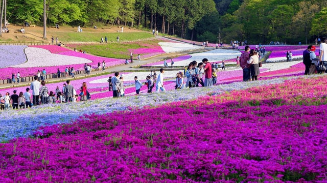 From mid-April to early May, Hitsujiyama Park (羊山公園) is bathed in pink. These are the shibazakura (pink moss phlox) grown all over the hill, hence its name Shibazakura Hill (Pink Moss Hill). Dubbed a Pink Paradise, the area is a beautiful sight to behold drawing in crowds of visitors every year.