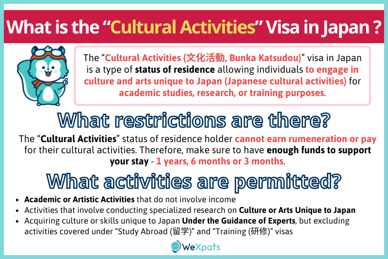Students coming from outside Japan can obtain a “Cultural Activities (文化活動, Bunka Katsudou)” status of residence (visa type). This type of visa allows students to engage in culture and arts unique to Japan (Japanese cultural activities) for academic studies, research, or training purposes.