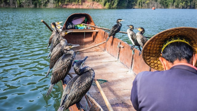 Ukai (鵜飼) or cormorant fishing is a traditional method of fishing. It involves training cormorants (also known as shags, a large breed of waterbird) to dive for fish.The practice of Ukai has been around in Japan for more than 1,300 years. Fishing typically starts at dusk, fishermen head out on their boats with several cormorants on board. A single fisherman may control up to 12 cormorants at one time. The birds are leashed at the neck, sent to dive, and return with fish in their mouths. The cormorants are happy to work as they are allowed to eat the smaller fishes.