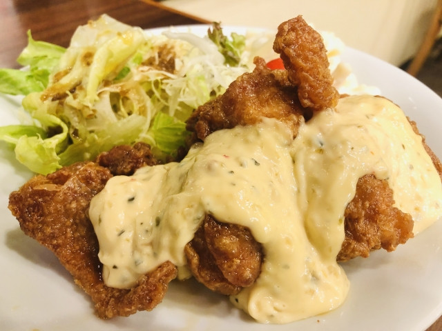 Chicken Nanban consists of Karaage soaked in Nanban Sauce, then served with tartar sauce. Nanban sauce is made from a boiled mixture containing vinegar as its key ingredient.