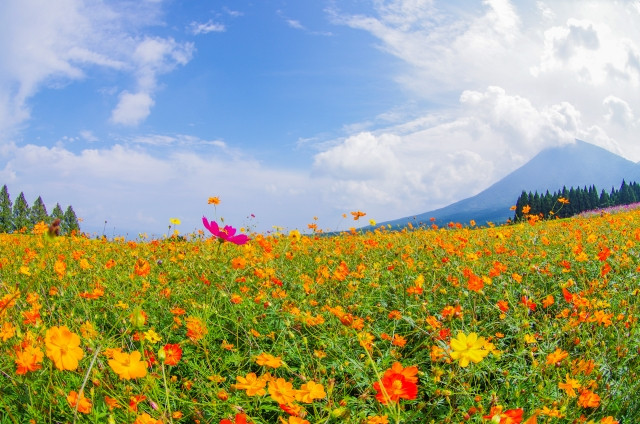 Set at the foot of Mt. Kirishima, Ikoma Plateau is a beautiful place where you can enjoy seasonal flowers: Poppies in April, Crape Myrtle and Hibiscus Mutabilis in July, and Cosmos in October. Aside from flower viewing, there are places you can visit and sights to see nearby including a wonderful seascape, Ebino Plateau 23-mins drive away with a free footbath and wonderful sights, Hinamori Auto Camping Ground 25-mins drive away for camping, and more.