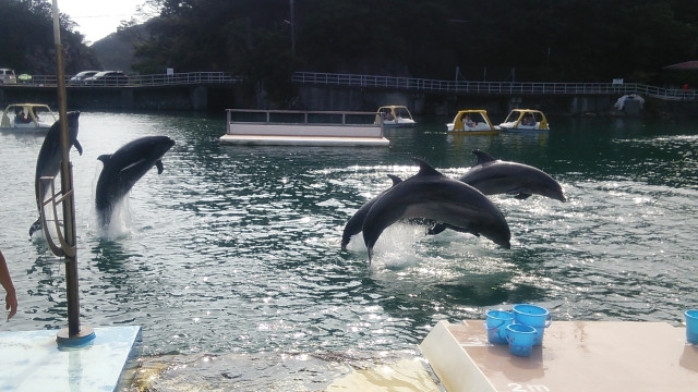 Shimoda Aquarium houses various species of aquatic animals. Rather than being in one building like most aquariums, it has a unique structure. The facilities are built around a bay, and one of the main buildings is in the bay itself, connected to the rest of the facilities by floating decks. Thus the arguably most popular attraction - the dolphins - are able to swim freely in the bay. So not only can you see the dolphin show - which you can opt to see even more up close - you can feed them, snorkel and go diving with them if you so wish! (for a separate fee of course)