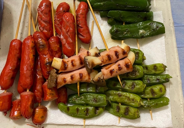 Vegetable skewers to make your meal healthier. Common ones are mushrooms, onions, and peppers. Meat stuffed green pepper skewers are tasty; the bitterness of the pepper blends well with sweet salty tare and the smoky taste and smell.