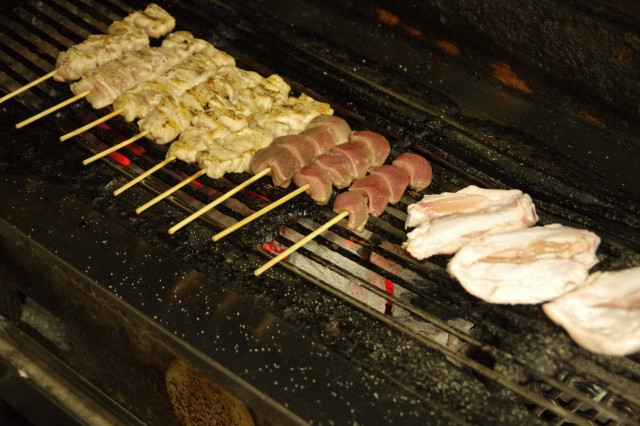 Yakitori are skewered bite-sized chicken grilled over a fire. They are usually available in two flavours, salted (塩 Shio) or sauced (たれ Tare).