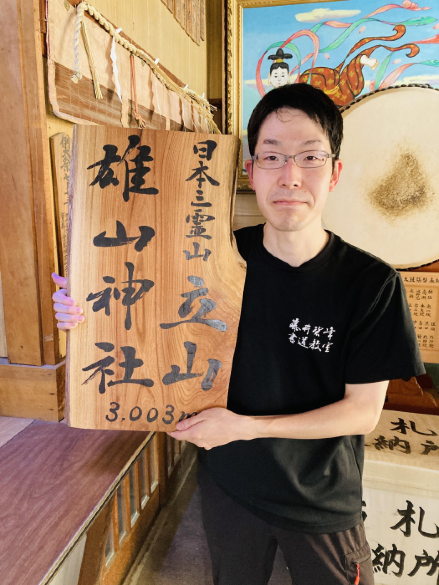One of his biggest achievements is writing a wooden plaque (shown below) for Minehonsha of Oyama Shrine on Mount Tate (Tateyama) in Toyama Prefecture, and then physically carrying it 30 kilometers as a pilgrimage to the summit (3000 meters above sea level) to personally dedicate the plaque to the shrine. Mount Tate is considered one of the three spiritual mountains in Japan.