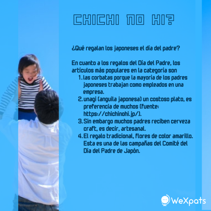 La celebración del Día del Padre en Japón ingresa desde el extranjero y es la tercera semana de Junio de cada año. El Día del Padre en Japón es un día en el que los niños y las madres saludan a los padres. Pero, ¿Qué implica ser padre en Japón? ¿Qué regalos les gusta dar a los japoneses a sus padres? ¿Cuál es la palabra que en décadas pasadas los padres usaban para referirse a sus hijos? Este artículo tiene la respuesta para ti.