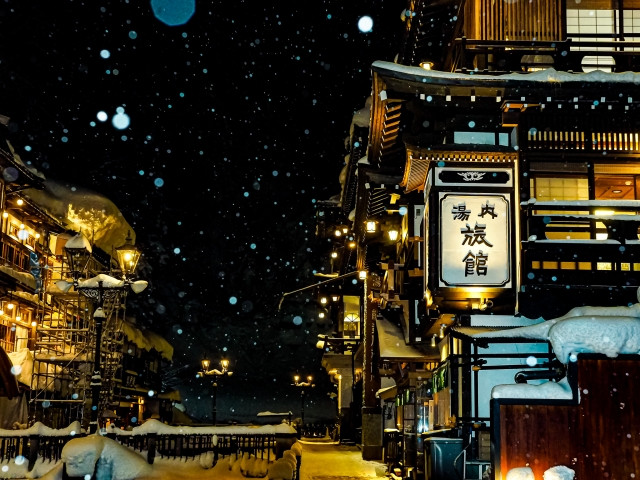 Ginzan Onsen es una zona donde cae nieve desde diciembre hasta mediados de marzo. Si lo visitas de noche, podrás apreciar el nostálgico y hermoso paisaje urbano iluminado por lámparas de gas.