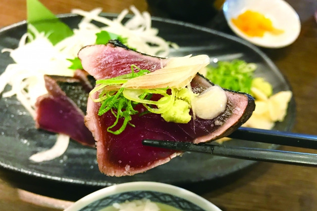 Si visitas Kochi, no dejes de probar el tataki de bonito. El tataki de bonito es un plato en el que la superficie del bonito cortada en trozos se chamusca, se remoja en agua y luego se cubre con muchos condimentos. Es un plato que se puede comer en todo Japón, pero se dice que el tataki de bonito que se come en la prefectura de Kochi, que cuenta con la mayor captura de bonito del país, es excepcional. Además de esto, son famosos el "inaka sushi" que utiliza ingredientes de los pueblos de montaña y la "cocina sawachi", que es un plato grande con varios ingredientes.