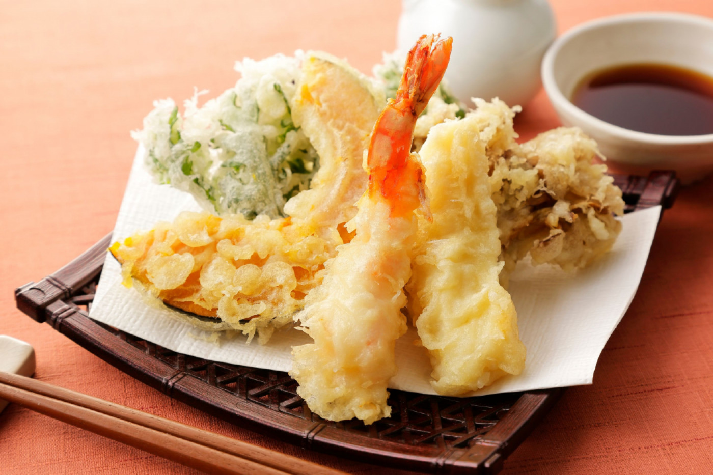 Tempura es un plato en el que los ingredientes se rebozan con huevos, harina y agua fría y luego se fríen . Se dice que este método de cocción fue introducido desde Portugal durante el período Muromachi. En ese momento, el aceite de cocina era un artículo de lujo, por lo que la tempura se consideraba un plato de lujo. Durante el período Edo, la producción de aceite aumentó, lo que permitió que más personas disfrutaran del plato, y la tempura se hizo popular como un manjar local en Edo.