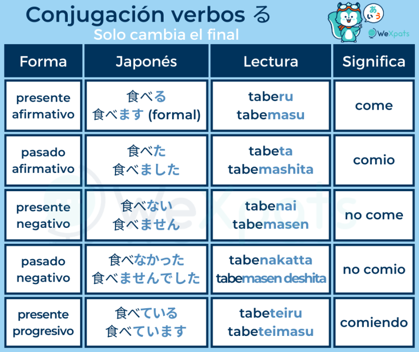 Los verbos-ru son fáciles de conjugar. Todo lo que necesitas hacer es cambiar el る (ru) para conjugar el verbo en forma educada, tiempo pasado, presente negativo, pasado negativo o presente progresivo.