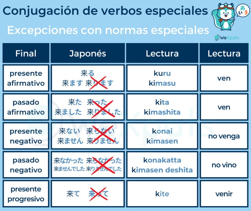 La siguiente tabla muestra las reglas de conjugación de los verbos irregulares 来る