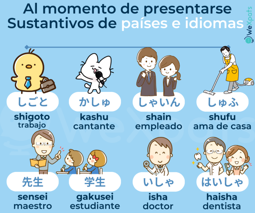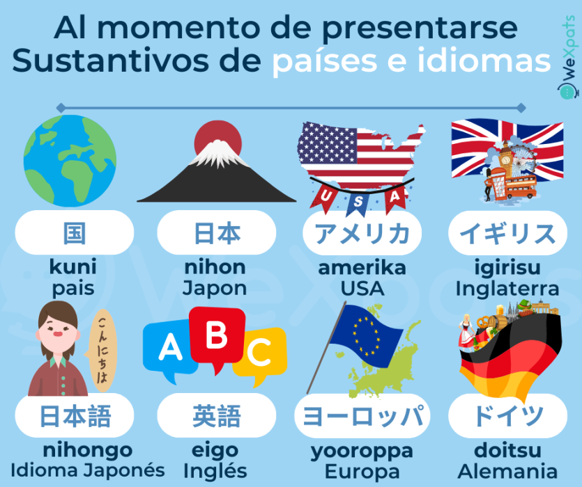 A continuación hay 5 categorías de sustantivos; países e idiomas, ocupación, colores, naturaleza y animales, que puede utilizar para presentarse.