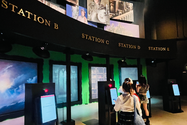 A continuación, nos adentraremos más en Hogwarts con la escalera que conduce a los dormitorios. Nos pidieron escanear un código y registrarnos para poder participar en las actividades aquí. La primera actividad fue una sesión de fotos. Hay una cabina para tomar fotos animadas, y las fotos aparecerán en un marco de fotos en la pared, ¡al igual que los marcos de fotos en movimiento en Harry Potter!